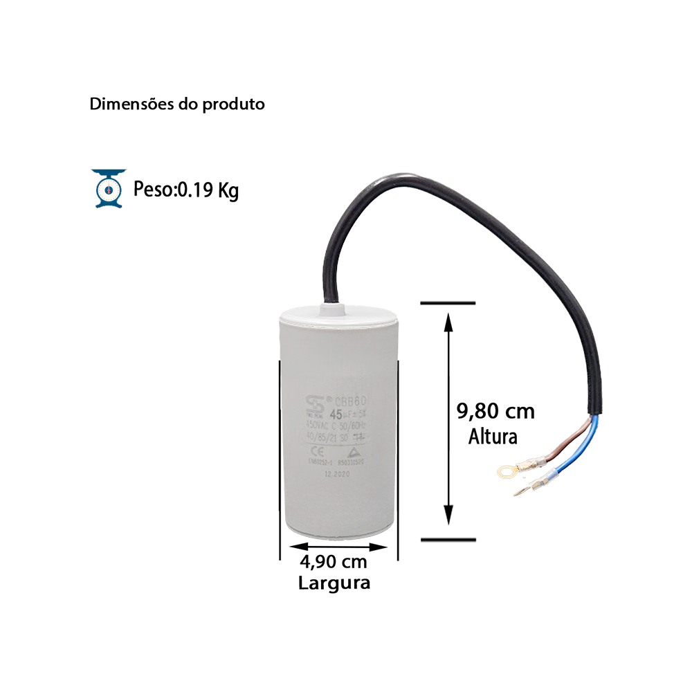 Capacitor 45uF/450V(50*92) para motor thebe monofásico de 3,0 cv IP55 DLYY80