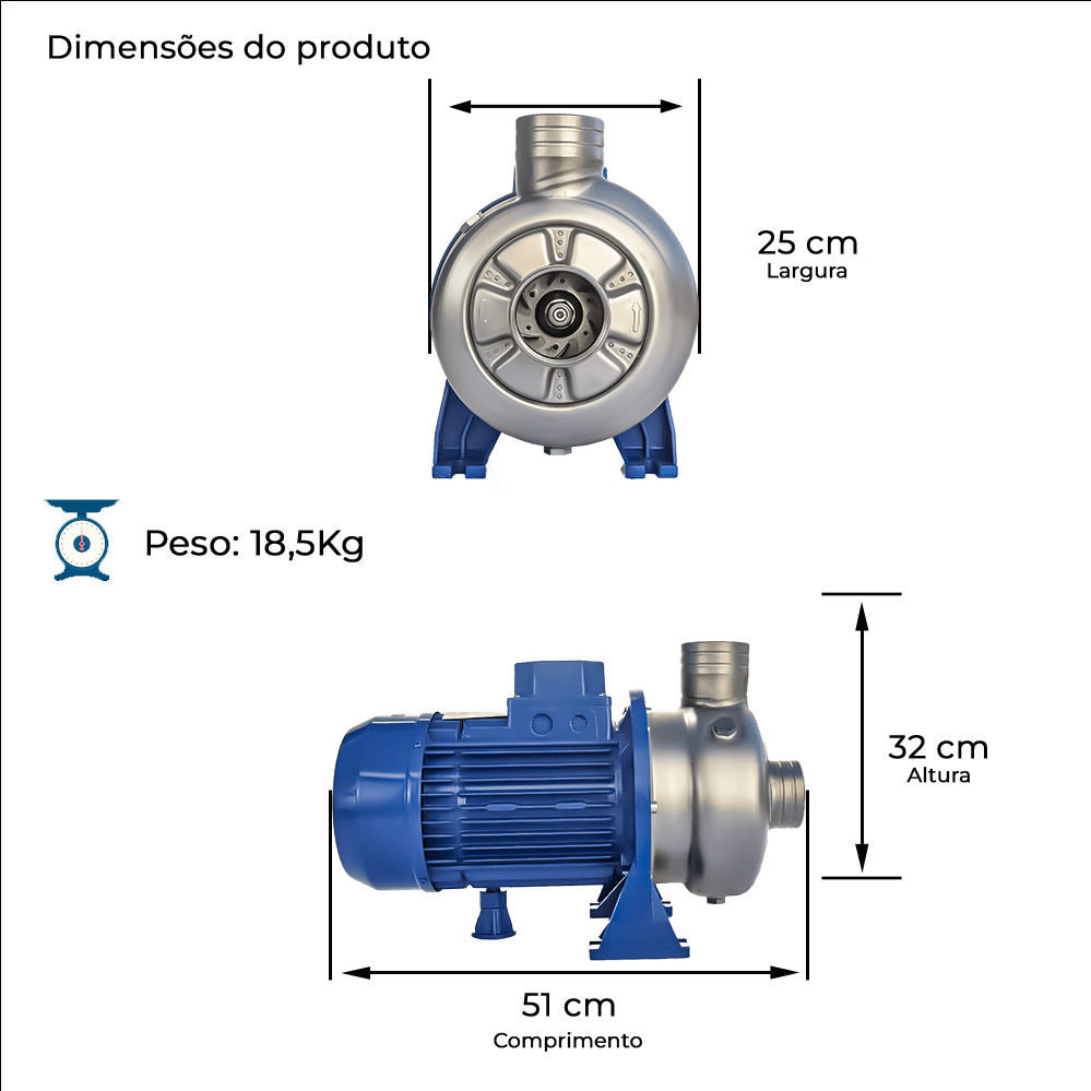 Carcaça em inox 304. Rotor em inox 304. Anel O'ring de vedação da carcaça em Buna N. Selo mecânico: Faces em grafite e cerâmica. Mola em inox 304 e elastômero (borracha) em Buna N.