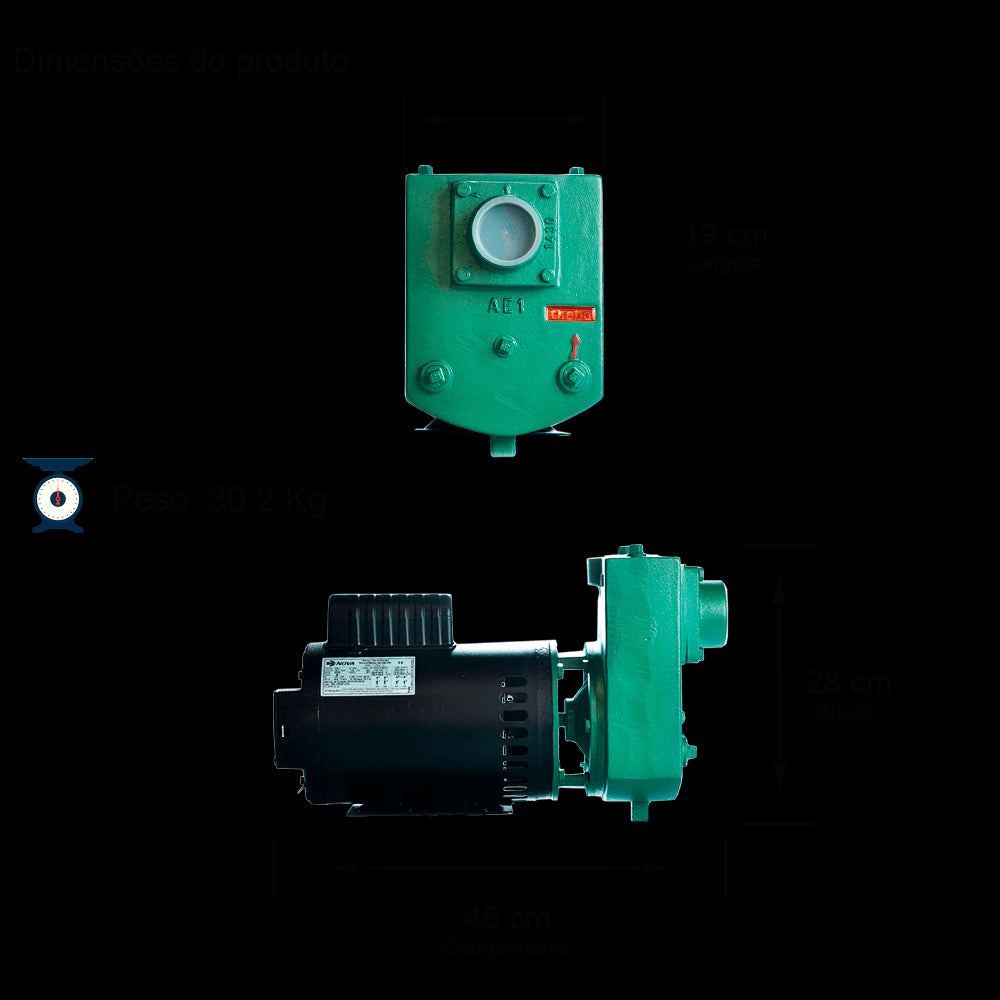 BOMBA AUTOESCORVANTE MONOESTÁGIO AEX-1 2,0 CV MOTOR MONOFÁSICO NOVA.IP21.2P.4V.110-127/220-254V.ROTOR SEMIABERTO Ø7/16X124MM. SELO MEC.5/8" T12 BUNA