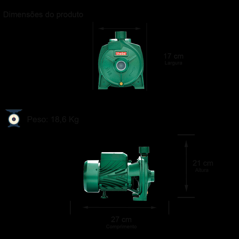 Motobomba Centrífuga Monoestágio - Monobloco - Motor Monofásico em II Polos, 60Hz, 3500rpm - Bocais com rosca BSP, Sucção 1.1/4" x Recalque 1". Sucção Frontal. Utilizada para água limpa até temperatura de 90ºC (Temperaturas superiores, consultar opções). Carcaça de sucção e Carcaça de Recalque em ferro fundido GG-20. Intermediário em ferro fundido GG-20. Rotor em bronze. Anéis O´ring de vedação em Buna N. Selo mecânico: Faces em grafite e cerâmica. Mola em inox 304 e elastômero (borracha) em Viton.