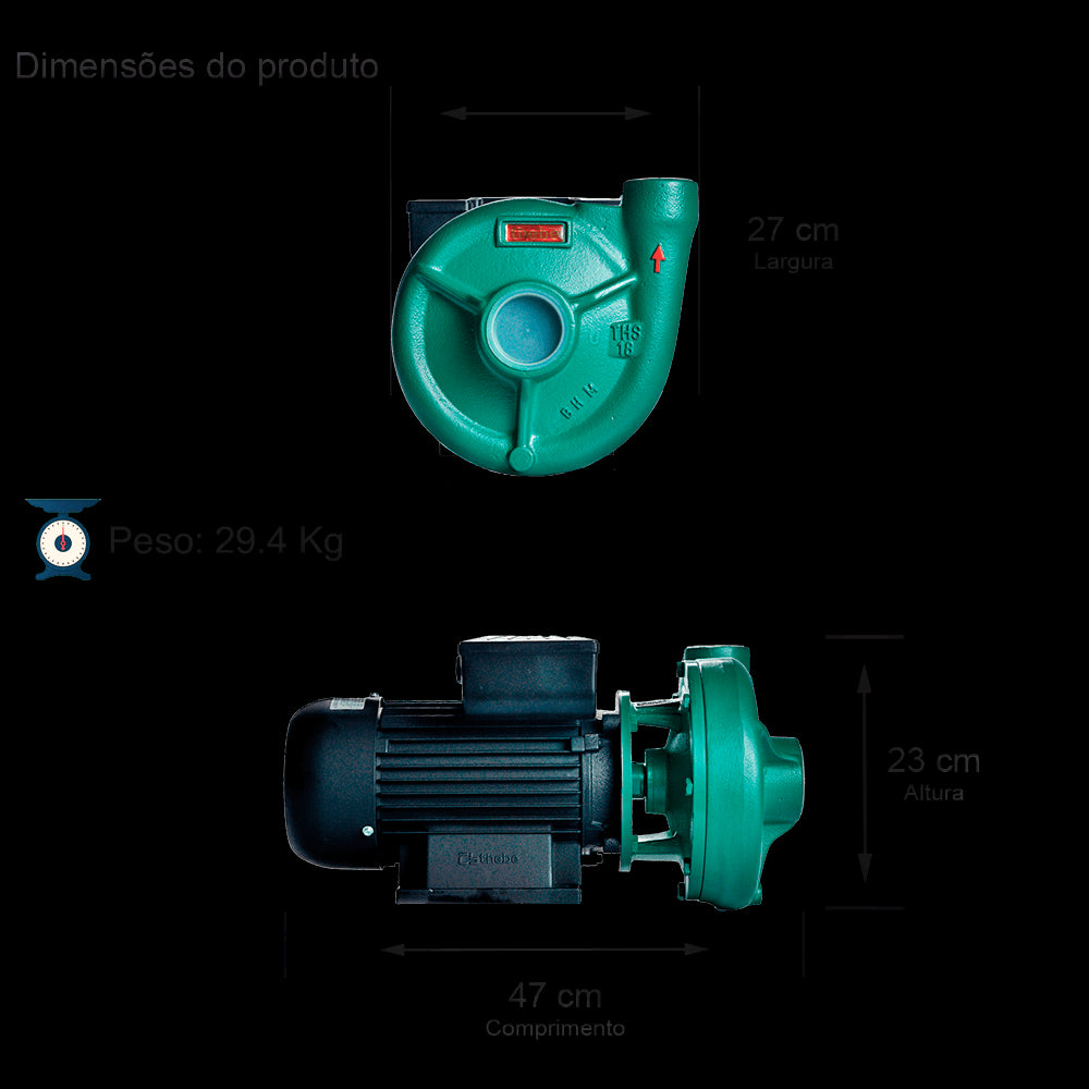 Motobomba Centrífuga Monoestágio - Monobloco - Motor Trifásico em II Polos, 60Hz, 3500rpm - Bocais com rosca BSP, Sucção 2" x Recalque 1.1/2". Utilizada para água limpa até temperatura de 70ºC (Temperaturas superiores, consultar opções). Carcaça em ferro fundido GG-20. Rotor em ferro fundido GG-20. Intermediário em ferro fundido GG-20. Anel O'ring de vedação da carcaça em Buna N. Selo mecânico: Faces em grafite e cerâmica. Mola em inox 304 e elastômero (borracha) em Buna N.