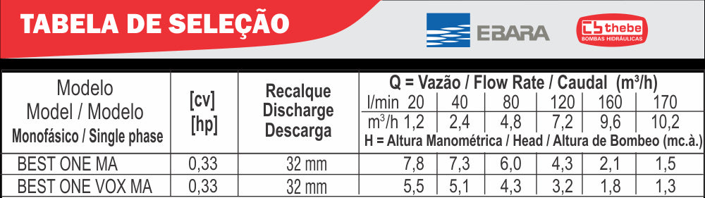 BOMBA SUBMERSÍVEL BEST ONE MA 1/3 CV MONOFÁSICO MOTOR EBARA IP68 220-230V