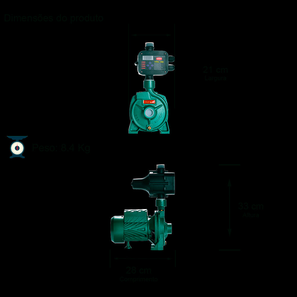 Controlador automático de pressão, necessita ser instalado/rosqueado no recalque de bombas com motores Monofásicos até 3,0 cv em 220 V ou até 1,0 cv em 127 V para pressurização de residências, construção civil e de equipamentos em geral compatíveis com as caraterísticas do produto. Possui as funcionalidades: Liga/Desliga automaticamente; Válvula de retenção incorporada; Ausência de vaso de expansão; Display digital; Pressão do sistema auto ajustável conforme cada bomba; Não necessita de parametrização; Proteção contra trabalho a seco; Proteção contra sobre tensão e sobre pressão; Religamento automático; Sistema contra travamento da bomba, devido após longo tempo de utilização acionar o equipamento. Utilizado para água limpa até temperatura de 40ºC com vazão máxima de 5m³/h e pressão máxima de 90mca. OBS.: O modelo de bomba a ser utilizado deverá estar condizente com os dados de projeto na qual será instalado. Construído em termoplástico. Válvula de retenção em latão. Motobomba Centrífuga Monoestágio - Monobloco - Motor Monofásico projetado para melhor dissipação de calor (através do design das aletas), IP-44 Bivolt com seletor de voltagem em II Polos, 60Hz, 3500rpm - Bocais com rosca BSP, Sucção 1" x Recalque 1". Utilizada para água limpa até temperatura de 70ºC (Temperaturas superiores, consultar opções). Carcaça em ferro fundido. Rotor em bronze. Ponta do eixo em aço inox (evita corrosão prematura). Anel O'ring de vedação da carcaça em Buna N. Selo mecânico: Faces em grafite e cerâmica. Mola em inox 304 e elastômero (borracha) em Buna N.