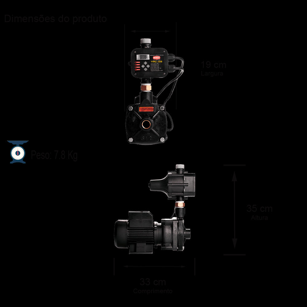 Controlador automático de pressão, necessita ser instalado/rosqueado no recalque de bombas com motores Monofásicos até 3,0 cv em 220 V ou até 1,0 cv em 127 V para pressurização de residências, construção civil e de equipamentos em geral compatíveis com as caraterísticas do produto. Possui as funcionalidades: Liga/Desliga automaticamente; Válvula de retenção incorporada; Ausência de vaso de expansão; Display digital; Pressão do sistema auto ajustável conforme cada bomba; Não necessita de parametrização; Proteção contra trabalho a seco; Proteção contra sobre tensão e sobre pressão; Religamento automático; Sistema contra travamento da bomba, devido após longo tempo de utilização acionar o equipamento. Utilizado para água limpa até temperatura de 40ºC com vazão máxima de 5m³/h e pressão máxima de 90mca. OBS.: O modelo de bomba a ser utilizado deverá estar condizente com os dados de projeto na qual será instalado. Construído em termoplástico. Válvula de retenção em latão. Motobomba Centrífuga Monoestágio - Monobloco - Motor Monofásico em II Polos, 60Hz, 3500rpm - Bocais com rosca BSP, Sucção 3/4" x Recalque 3/4". Utilizada para água limpa até temperatura de 40ºC. Carcaça, rotor e tampa traseira em termoplástico. Anel O'ring de vedação da carcaça em Buna N. Selo mecânico: Faces em grafite e cerâmica. Mola em inox 304 e elastômero (borracha) em Buna N.