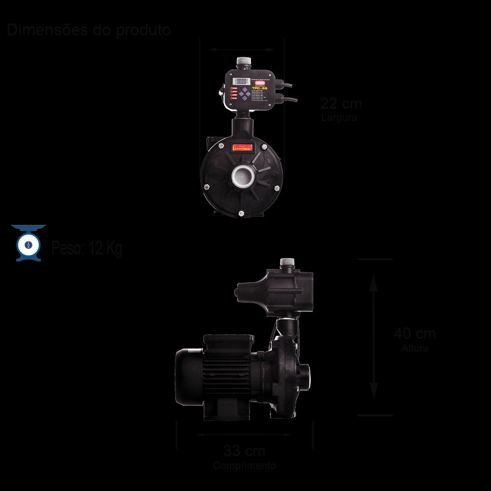 Motobomba Centrífuga Monoestágio Monobloco com pressurizador TPC-58 na tensão 127V - Motor Monofásico de 3/4cv IP-55, II Polos, 60Hz, 3500rpm - Bocais com rosca BSP, Sucção 1.1/2" x Recalque 1". Utilizada para água limpa até temperatura de 40ºC. Vazão Máxima: 5,5m³/h - Vazão Mínima: 1,0m³/h; Pressão Máxima: 26,0mca - Pressão Mínima: 4,6mca. A bomba com o pressurizador TPC-58 possui as características abaixo: Válvula de retenção incorporada; Ausência de vaso de expansão; Display digital; Pressão do sistema auto ajustável conforme cada bomba; Não necessita de parametrização; Proteção contra trabalho a seco; Proteção contra sobre tensão e sobre pressão; Religamento automático; Sistema contra travamento da bomba, devido após longo tempo de utilização acionar o equipamento. Carcaça, rotor e tampa traseira em termoplástico; Ponta do eixo em aço inox (evita corrosão prematura); Anel O'ring de vedação da carcaça em Buna N; Selo mecânico: Faces em grafite e cerâmica. Mola em inox 304 e elastômero (borracha) em Buna N.